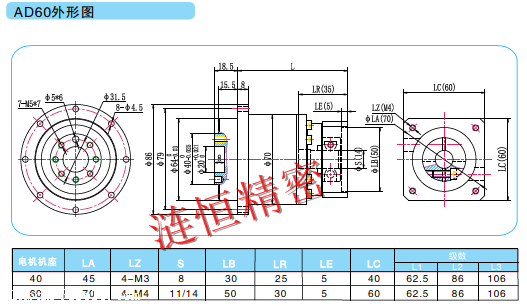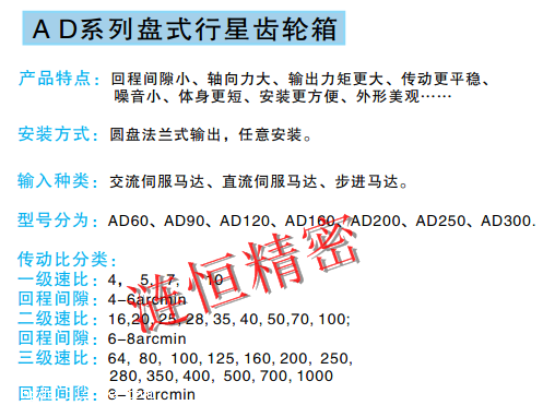 产品详情:AD系列精密行星齿轮减速机:同轴法兰输出,精度高,刚性好,承载能力大,
